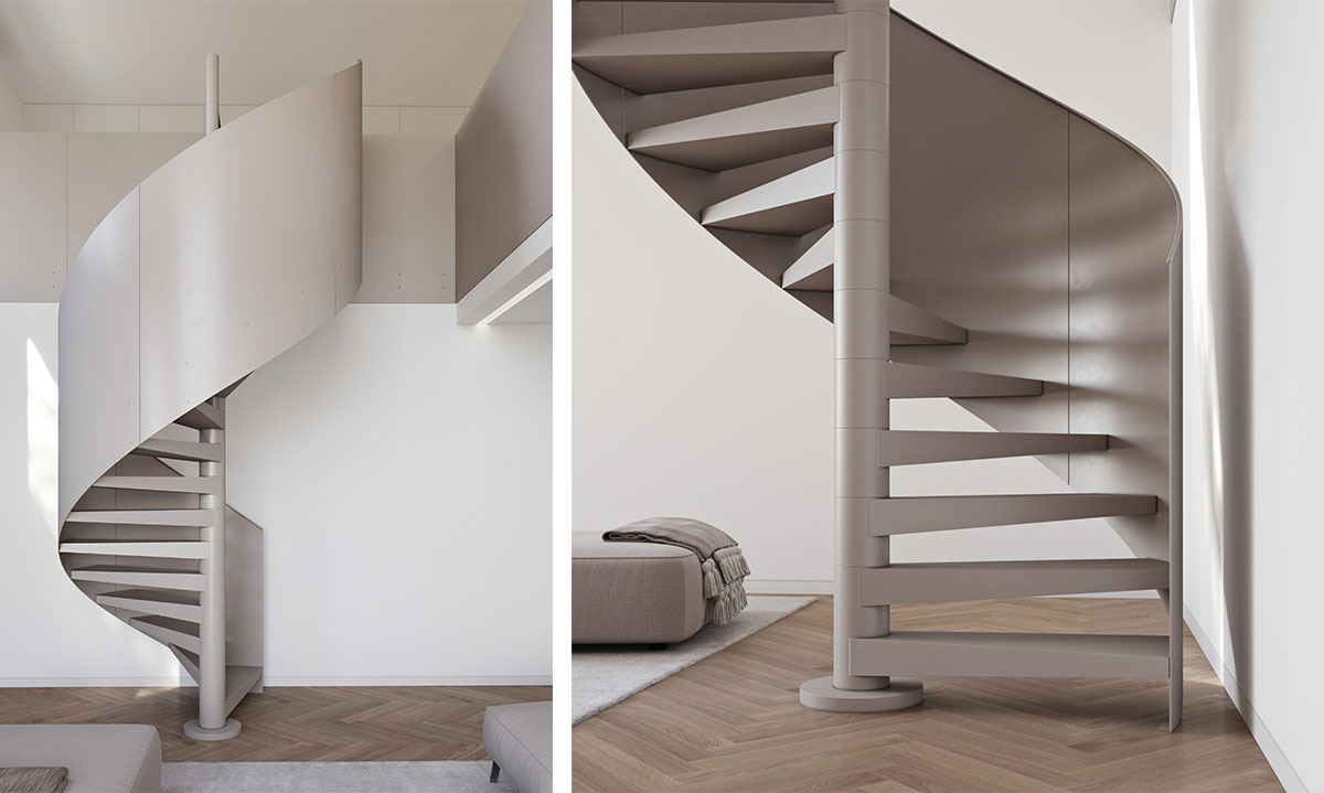 Schodiště CIRCLE, celokovové provedení s plným kovovým zábradlím, precizní svařovaná konstrukce bez viditelných spojů.